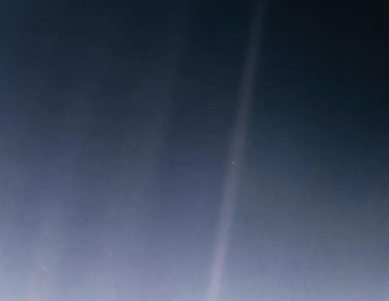 Em 1990 a sonda Voyager tirou uma foto da Terra a uma distância de cerca de 6 bilhões de quilômetros. A ideia foi de Carl Sagan, astrônomo midiático norte americano. Ele convenceu a NASA a virar a câmera da sonda para nosso planeta, antes que a aposentadoria do ilustre equipamento fosse decretada pelo desligamento de seu sistema de imagens. Assim, com a imagem do minúsculo e tímido ponto azul, Sagan mostrava a todos os seres humanos, a pequenez e fragilidade de sua existência.