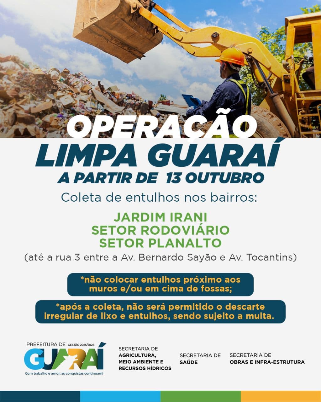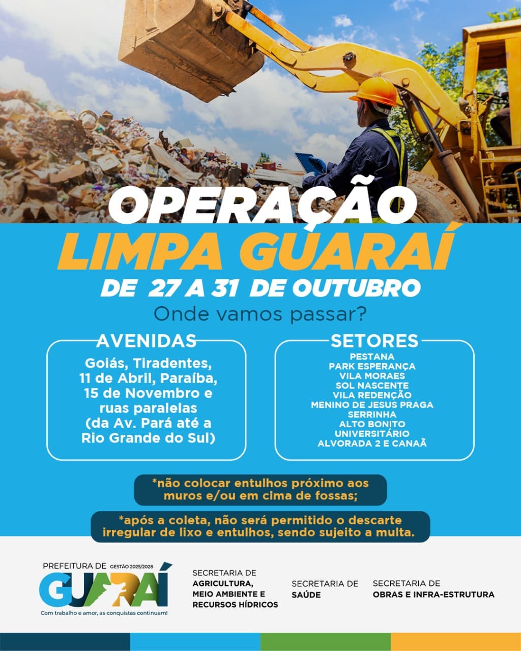 A operação “Limpa Guaraí” vai atender + 10 bairros entre 27 e 31 de outubro, incluindo o Setor Pestana. É a 3ª etapa da ação de enfrentamento do mosquito Aedes Aegypti, transmissor de doenças como a Dengue, Zika Vírus e a Febre Chikungunya. A iniciativa, da prefeitura local, teve início no último dia 13 de outubro e, conforme planejado, vai abranger todo o perímetro urbano local.