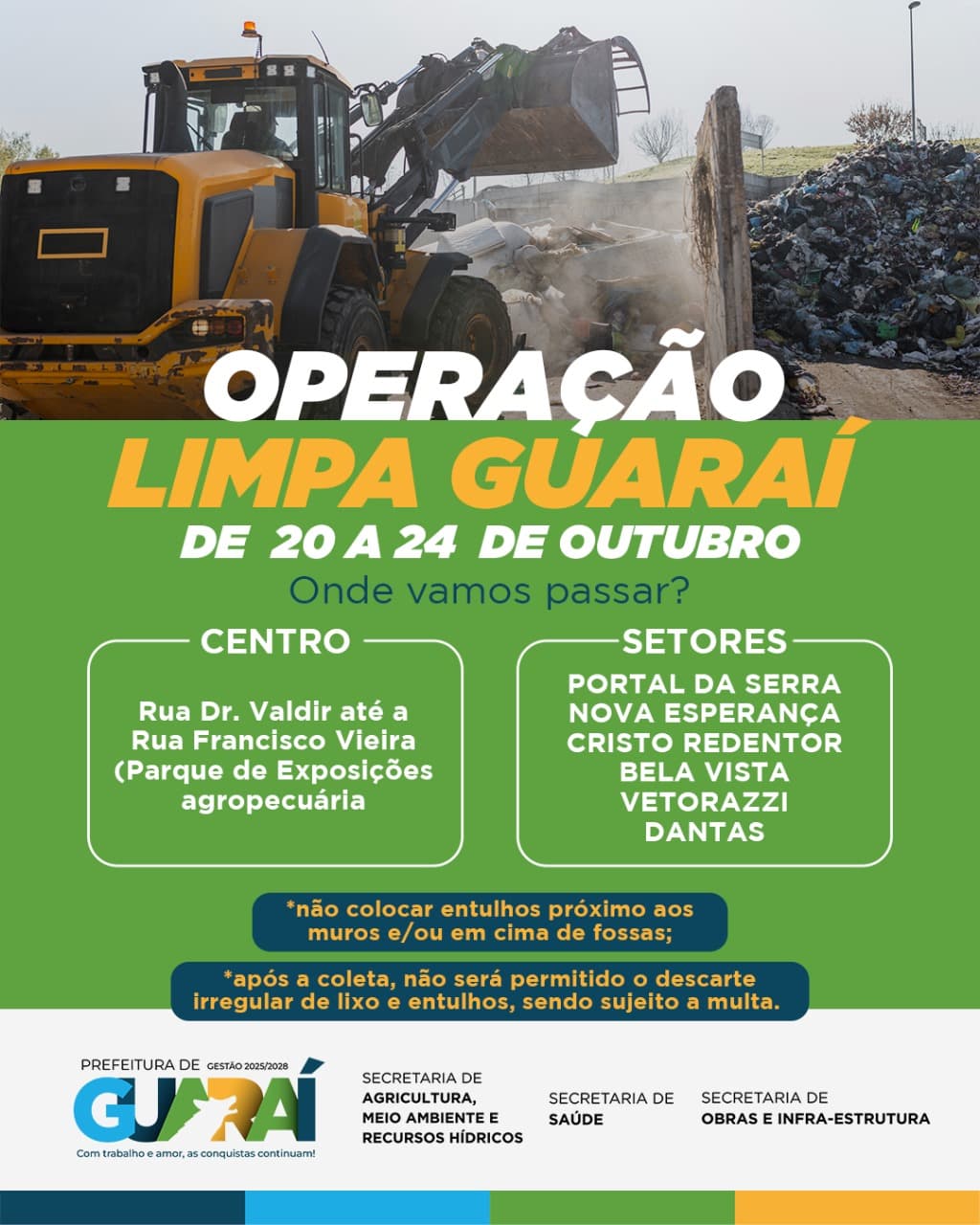 O trabalho reúne equipes das secretarias de Obras, Agricultura e Saúde. O foco é o recolhimento de entulhos e materiais que acumulem água da chuva. Durante a operação, também estão sendo realizadas ações de orientação porta a porta, enfatizando que, após o período definido, não será permitido o descarte nas calçadas, situação que poderá resultar em notificação ou aplicação de multas.