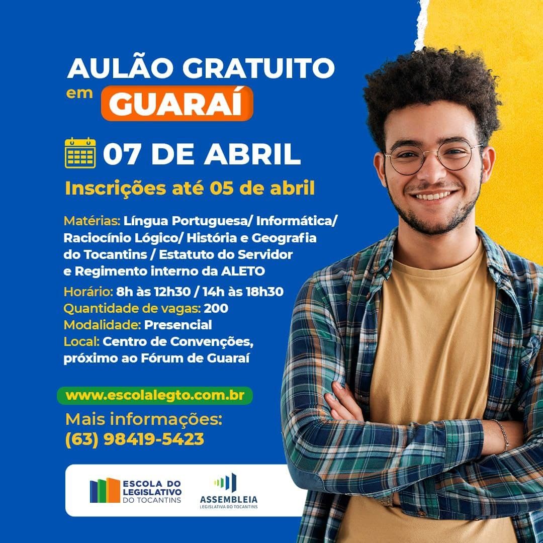 A Assembleia Legislativa do Tocantins (Aleto) está com inscrições abertas para um ‘aulão’ gratuito em Guaraí, que acontece no dia 07 de abril (domingo), focado no concurso da própria Casa de Leis Estadual, que possui provas agendadas para dia 14 deste mês. As inscrições seguem abertas até quinta-feira, 05, lembrando que o preparatório será realizado no Centro de Eventos “Saboião”.