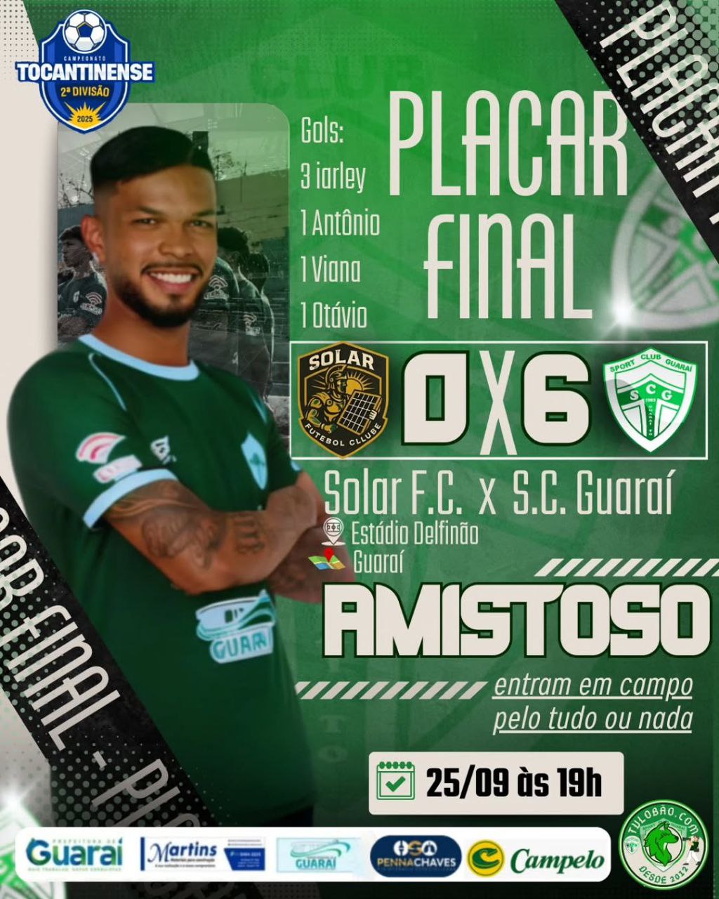 O Sport Club Guaraí (Lobão) segue atropelando adversários nos amistosos preparatórios para a 2ª Divisão Profisisonal do Tocantins. Depois de um sonoro 7x1 contra o Tabocão FC fora de casa no último dia 20 de setembro, desta vez a equipe goleou o Solar FC em Guaraí por 6x0 na última quinta-feira, 25 de setembro, com destaque para o jovem Iarley, autor de três gols nesta partida.