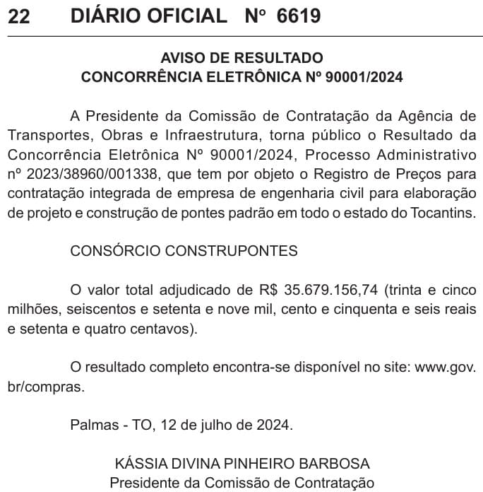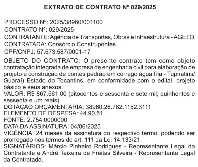 A obra, com duração prevista de 24 meses, integra um contrato com valor global de R$ 35.679.156,74 firmado no ano passado entre o Governo do Tocantins e o Consórcio Construpontes, sediado em Ribeirão Cascalheira-MT, que prevê a construção de 60 pontes em várias regiões do Tocantins, sendo 25 com até 10 metros, 20 com 15 metros, 10 com 20 metros e apenas 5 com 30 metros ou mais.