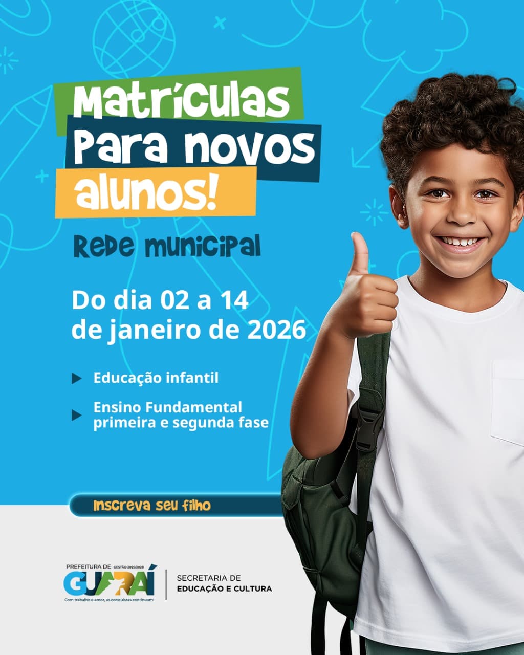 As matrículas e rematrículas online estarão disponíveis no site oficial da Prefeitura (guarai.to.gov.br) durante o mês de janeiro, garantindo mais rapidez, praticidade e conforto às famílias. Pelo sistema digital, responsáveis confirmam vagas sem filas, otimizando o atendimento. As escolas acompanham, em tempo real, a organização da oferta das turmas por etapa, turno e modalidade escolar.