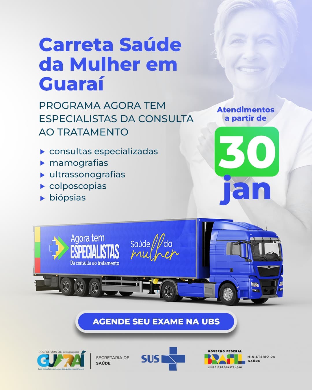 A “Carreta da Mulher” oferecerá atendimentos em Guaraí a partir deste mês. A unidade móvel integra o programa “Agora Tem Especialistas”, do Governo Federal e os atendimentos começam no dia 30 de janeiro, com duração de 30 dias. Para ter acesso, é preciso solicitar encaminhamento na Unidade Básica de Saúde (UBS) mais próxima. A ação é aberta para todos os municípios da região.