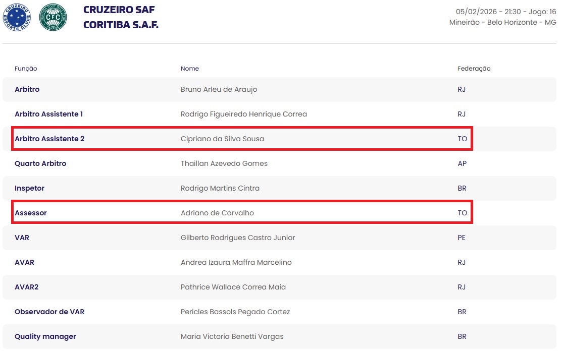 O Árbitro Principal será Bruno Arleu de Araujo do Rio de Janeiro e o outro Árbitro Assistente escolhido é Rodrigo Figueiredo Henrique Correa, também do Rio de Janeiro. Além de Cipriano, a arbitragem tocantinense estará representada no confronto por Adriano de Carvalho, presidente da Comissão Estadual de Arbitragem do Futebol (CEAF) da Federação Tocantinense de Futebol (FTF), que atuará como Assessor de Arbitragem dentro da equipe com 11 profissionais.