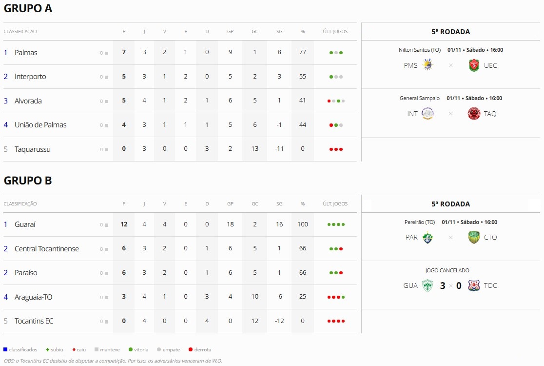 Obs.: O Tocantins de Miracema desistiu de disputar o torneio e todos os seus jogos foram declarados como vitória para os adversários com WO e placar de 3x0.