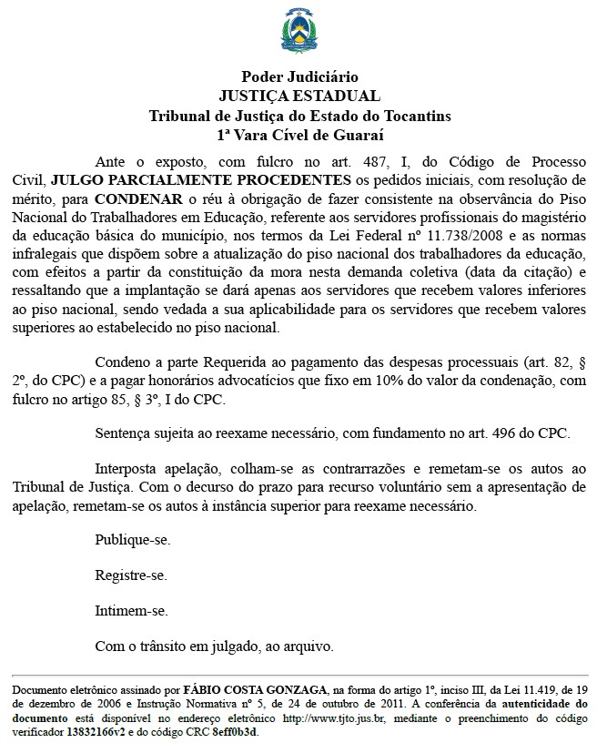 Uma decisão da Justiça de Guaraí, datada da última terça-feira, 18 de fevereiro, reconheceu parcialmente o direito pleiteado em ação coletiva pelo Sindicato dos Trabalhadores em Educação do Estado do Tocantins (SINTET), garantindo que a Lei do Piso Nacional dos Professores seja aplicada no município. Apesar disso, a sentença, que ainda cabe recurso, desconsidera sua efetivação na carreira.