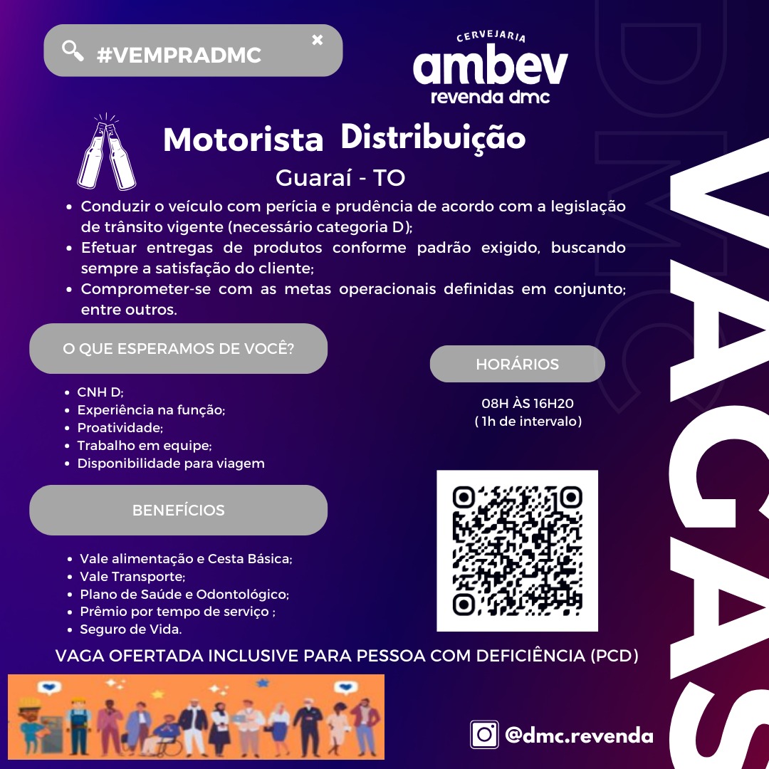 A empresa DMC, revenda autorizada da Ambev em 67 municípios do Tocantins, está recrutando candidatos para preencher vagas de emprego para Motorista de Distribuição em Guaraí. Pessoas com Deficiência (PcD´s) também podem concorrer. O cadastro dos currículos é efetivado por meio de formulário online.