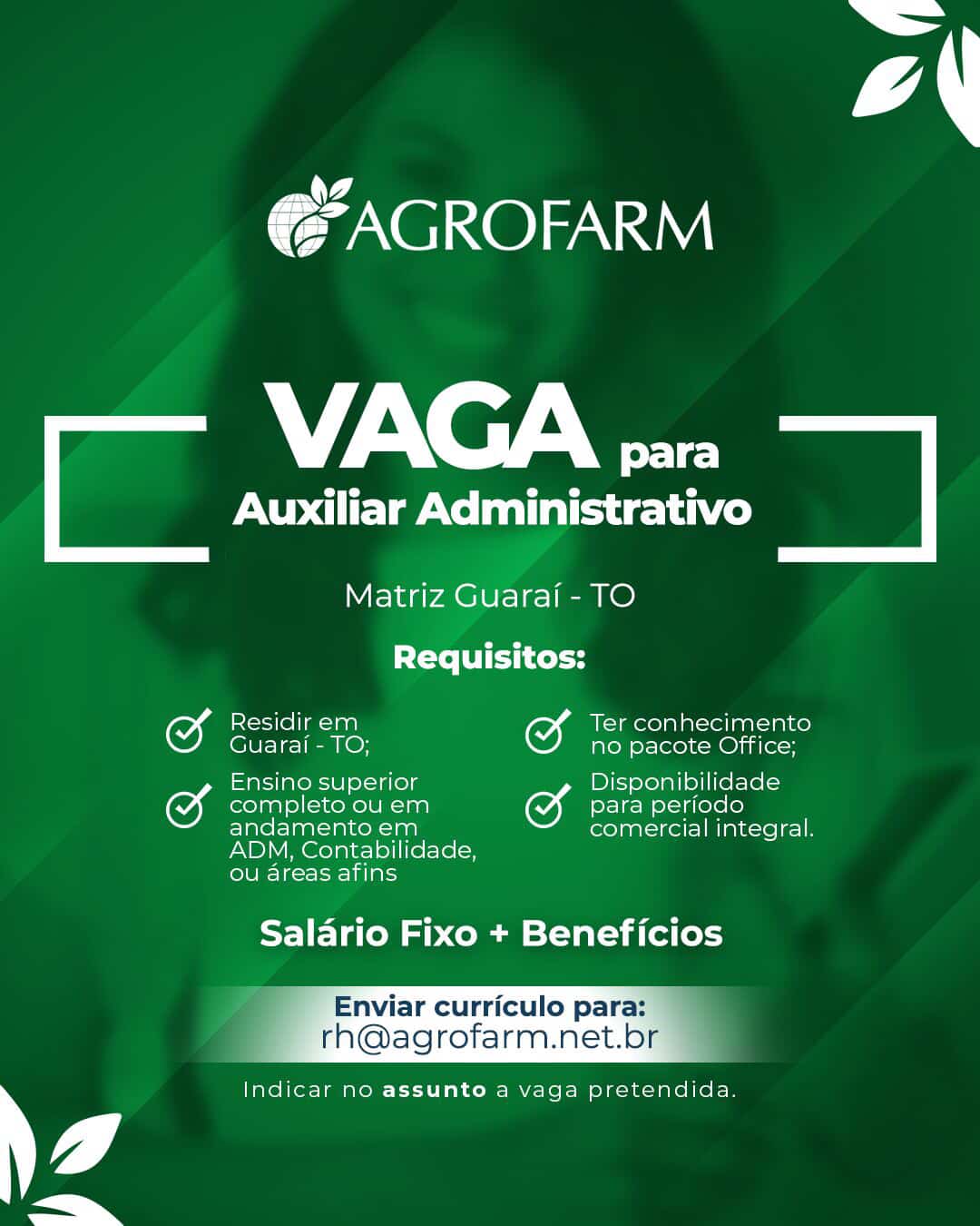 A empresa AGROFARM está com seleção aberta para uma vaga de Auxiliar Administrativo em Guaraí. A oportunidade prevê contratação com salário fixo e benefícios, reforçando o quadro funcional da empresa. Podem concorrer candidatos que residam no município e possuam Ensino Superior completo ou em andamento em áreas como Administração, Contabilidade, entre outras.