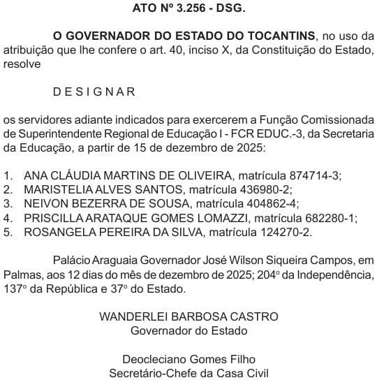 O governador Wanderlei Barbosa (Republicanos), que retomou o cargo após decisão do Supremo Tribunal Federal (STF), reconduziu Priscilla Arataque Gomes Lomazzi ao comando da Superintendência Regional de Educação (SRE) de Guaraí nesta última sexta-feira, 12 de dezembro. Ela havia sido substituída por Fábio Geraldo Cândido Ramos, que permaneceu na função apenas 17 dias, tendo sido nomeado por Laurez Moreira (PSD), então governador em exercício.