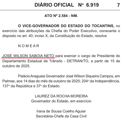 O governador interino Laurez Moreira (PSD) nomeou nesta terça-feira, 14 de outubro, o guaraiense José Wilson Saboia Neto, mais conhecido como Saboinha Jr, que passa a comandar o Departamento Estadual de Trânsito do Tocantins (Detran/TO). Ele volta a ocupar função no alto escalão do Governo do Estado, lembrando que já foi gestor da pasta de Ações Estratégicas entre 2023 e 2024.