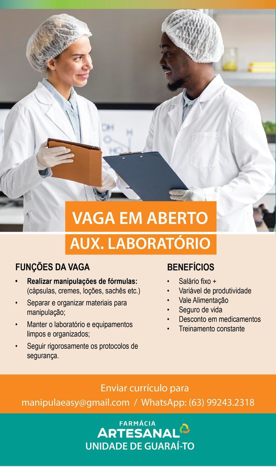 No Império do Churrasco, o cargo exige conhecimentos básicos de cozinha e boa comunicação. Já na Farmácia Artesanal, o auxiliar atuará na manipulação de fórmulas, organização do laboratório e cumprimento de protocolos de segurança. Mais informações podem ser obtidas no material publicitário abaixo.