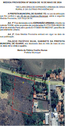 Foi publicada nesta última sexta-feira, 17 de maio, a Medida Provisória (MP) Nº 06/2024, assinada pela prefeita Fátima Coelho (União Brasil), que amplia o perímetro urbano do município de Guaraí. A ideia é construir 96 moradias populares no local, situado às margens da Avenida Pará. Os recursos seriam direcionados pelo Governo Federal, via programa “Minha Casa, Minha Vida”.