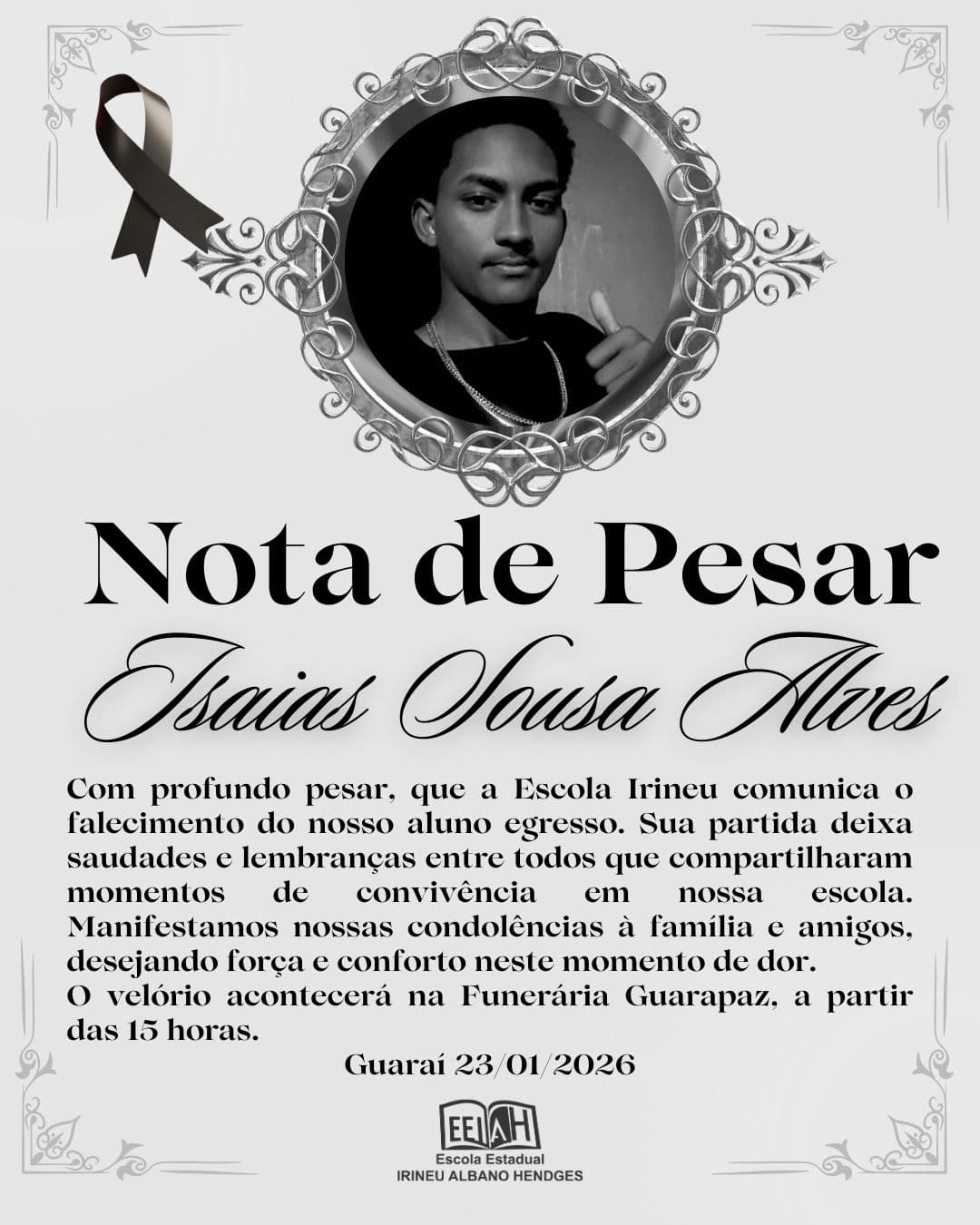 Foi sepultado nesta sexta-feira, 23 de janeiro, o jovem Isaias Sousa Alves, de apenas 18 anos, que teve morte encefálica confirmada após sofrer grave sinistro de trânsito em Guaraí dias antes. Graças ao gesto de amor de familiares, vários de seus órgãos foram doados no dia anterior, naquela que acabou sendo a primeira captação múltipla do ano no Hospital Regional de Araguaína (HRA).