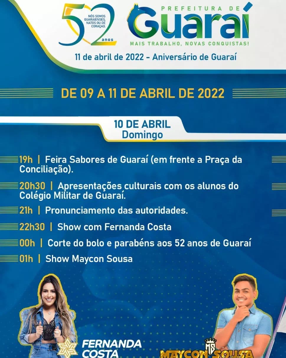 A cantora paraense Fernanda Costa, que faz sucesso em todo o Brasil e já residiu em Guaraí, será a grande atração da programação alusiva ao aniversário de 52 anos de emancipação política do município, celebrado no dia 11/04. A artista se apresenta no dia anterior e a apresentação será aberta ao público.