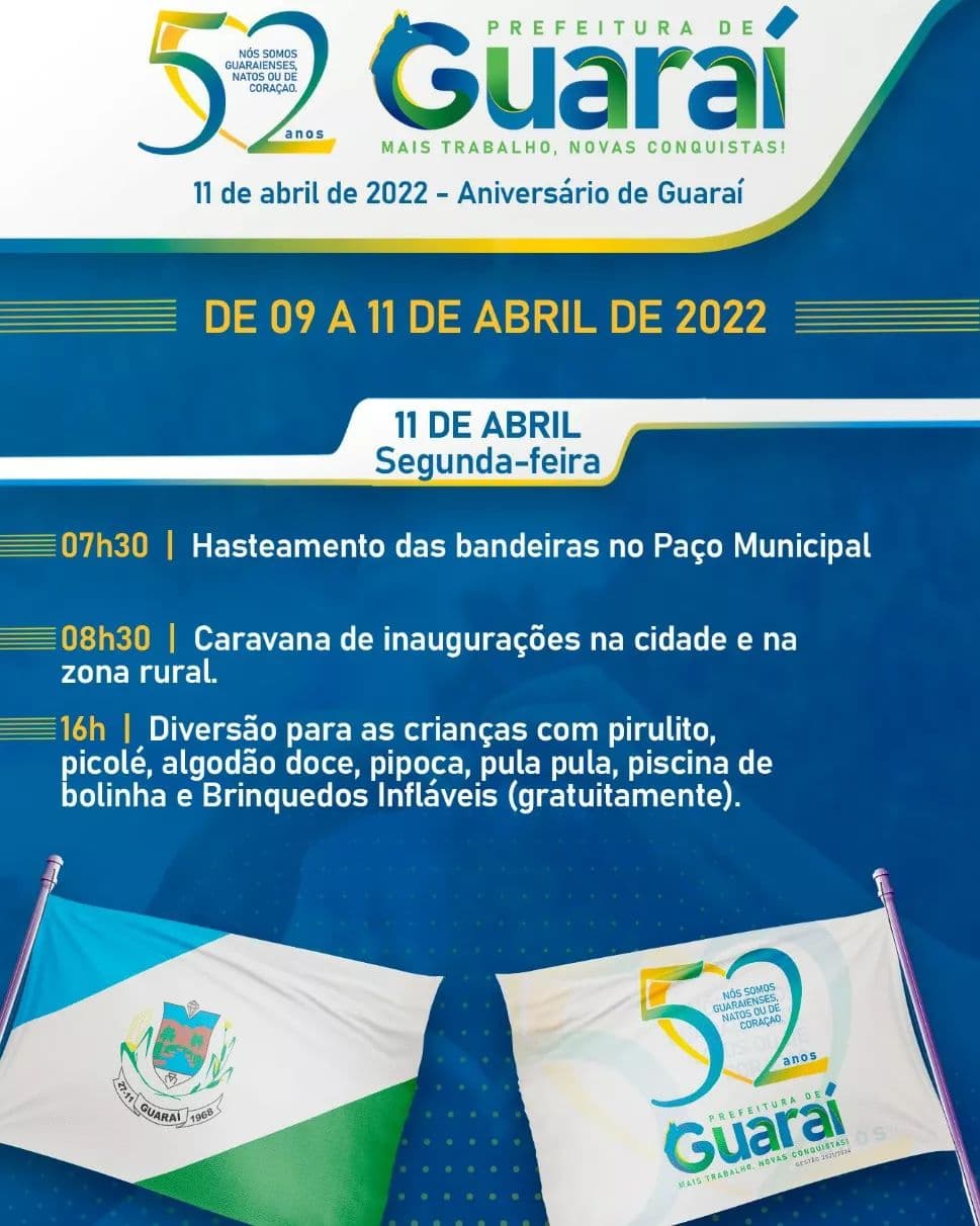 Vale destacar que este será o 1º evento público de aniversário do município desde o início da pandemia Covid-19 em março do ano de 2020. A maior parte dos shows e apresentações vão acontecer na Praça da Conciliação Prefeito Euclides de Lima Rodrigues, mais conhecida como “Praça da Prefeitura”.