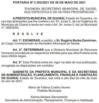 De acordo com informações da assessoria de comunicação da Prefeitura de Guaraí, Rogério solicitou o afastamento, alegando motivações pessoais. Ele havia sido nomeado no lugar do farmacêutico Emival Nunes da Fonseca, que também pediu demissão, após ser denunciado por acumulo de funções públicas.