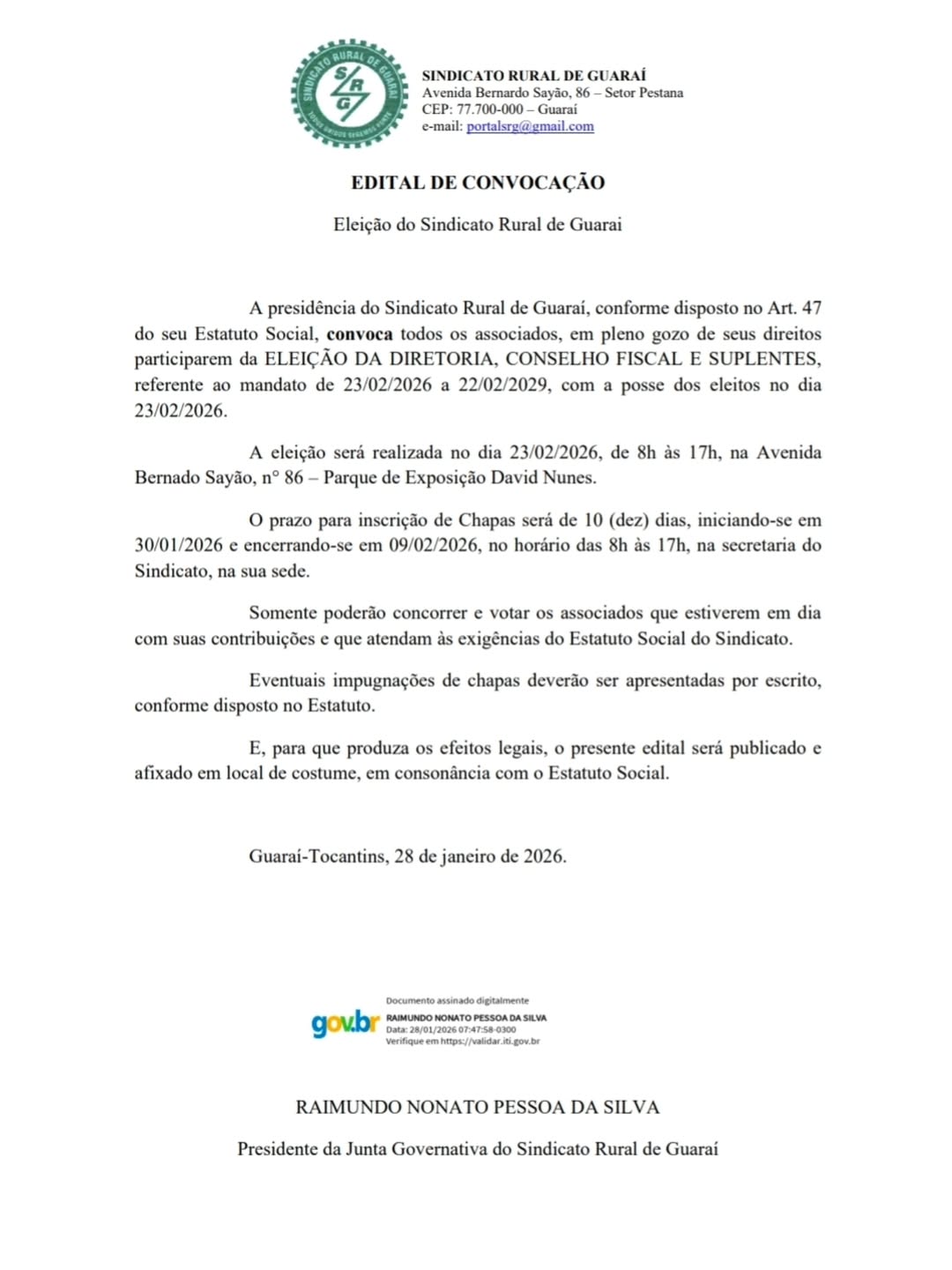 O Sindicato Rural de Guaraí (SRG) publicou edital convocando associados para a eleição da Diretoria, Conselho Fiscal e Suplentes da entidade no mandato 2026/2029. O pleito está marcado para o dia 23 de fevereiro, das 8h às 17h. Atualmente a entidade é comandada por uma Junta Governativa, encabeçada por Raimundo Pessoa, que já antecipou não ter intenção de continuar na função.