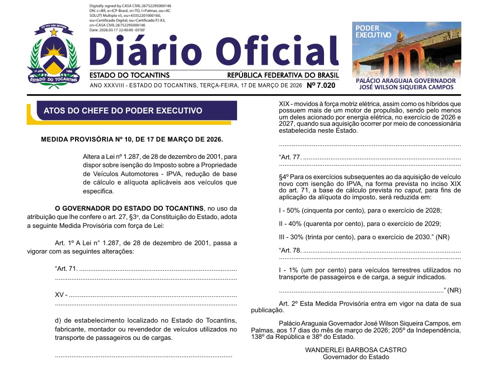 Em vídeo repercutido pelas redes sociais, o governador salientou que a MP, já publicada no Diário Oficial do Estado (DOE), incentiva a modernização da frota tocantinense, fortalecendo a economia e gerando empregos. Vale destacar que uma legislação sancionada no ano passado (Lei Estadual N.º 4.903/2025), já isentava o IPVA de veículos elétricos e híbridos adquiridos no Estado em 2026.