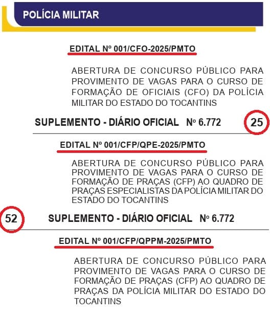 Foram publicados na noite desta última segunda-feira, 10 de março, em edição suplementar do Diário Oficial do Estado (DOE), três editais que regulamentam o novo concurso público da Polícia Militar do Tocantins (PM/TO), ofertando 660 vagas com salários de até R$ 10.842,13. As inscrições vão de 17 de março a 15 de abril e a banca responsável pelo certame é a Fundação Getúlio Vargas (FGV).