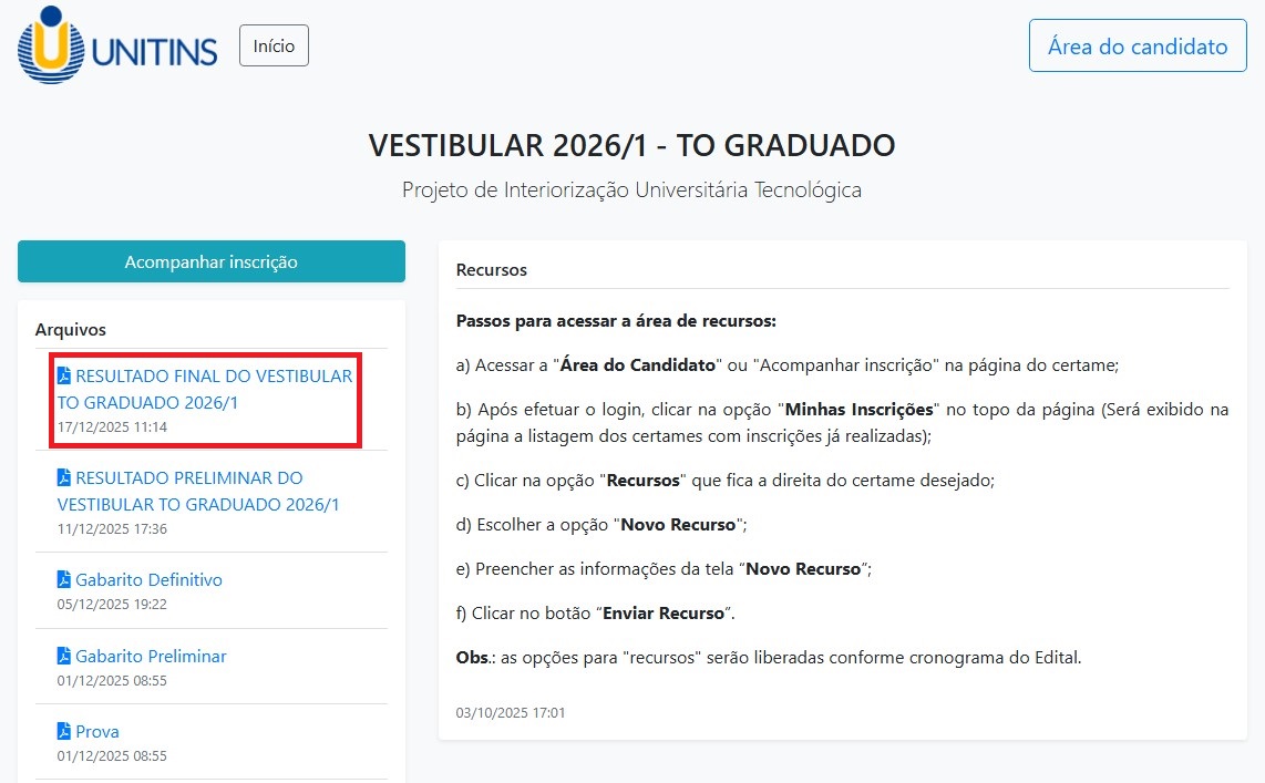 A Universidade Estadual do Tocantins (Unitins) publicou, nesta quarta-feira, 17 de dezembro, dois dias antes do prazo previsto, o resultado definitivo dos aprovados no Vestibular 2026/1 para os cursos ofertados por meio do ‘TO Graduado’. No total eram ofertadas 1.240 vagas em 15 polos, sendo 80 delas em Guaraí. A previsão é de que as matrículas iniciem já na próxima semana.