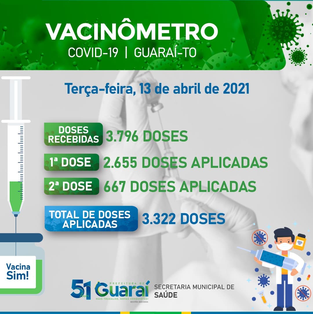 Vale destacar que Guaraí recebeu apenas 3.796 doses de vacinas para uma população estimada de 26 mil habitantes e aplicou quase 90% deste total em idosos com mais de 65 anos, profissionais da saúde e da segurança pública, grupos que, pela quantidade insuficiente, ainda não foram totalmente atendidos.