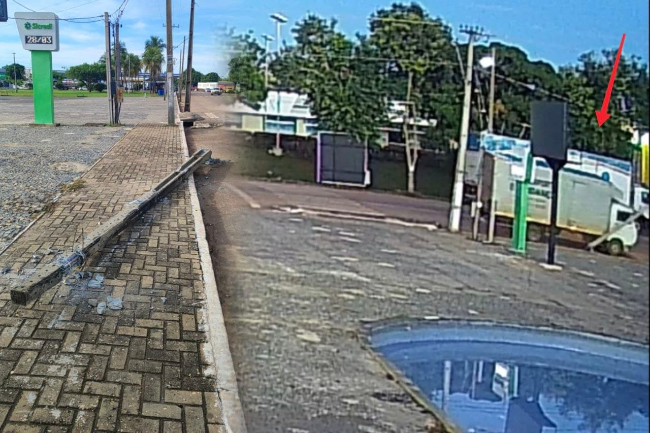 Baú de mudança faz manobra ‘esquisita’ e derruba poste próximo à Praça da Prefeitura em Guaraí